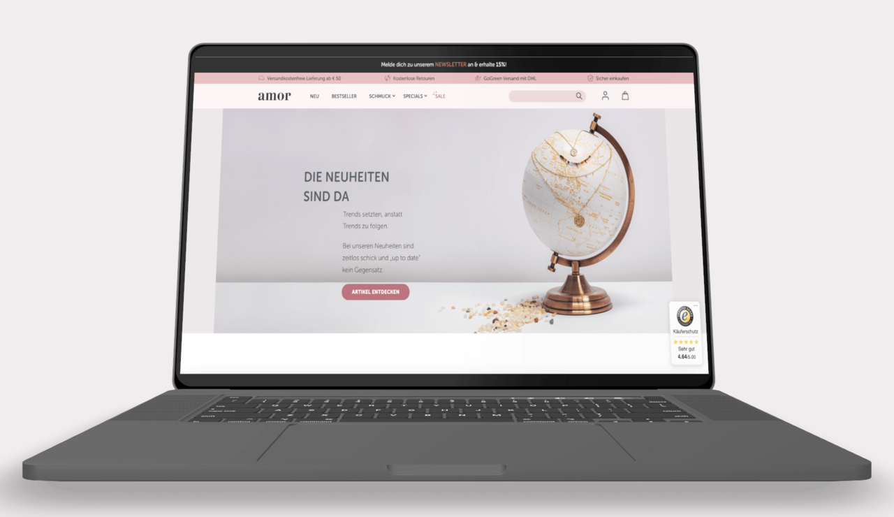 Seit über 40 Jahren vertreibt Amor Echtschmuck und ist Europas Marktführer im mittleren Preissegment. Mit der Konzeption und Umsetzung des neuen Onlineshop hat der Schmuckhersteller Neofonie beauftragt, die hierfür die entsprechende Technologielandschaft basierend auf dem Shopsystem Shopware 6 liefert. Die flexible Headless Struktur von Shopware 6 bietet zahlreiche Erweiterungen und eröffnet Amor vielfältige Möglichkeiten zu wachsen, neue Services anzubieten und damit den Kundenbedürfnissen nachzukommen. Im Mittelpunkt des Shops steht ein unverwechselbares Nutzererlebnis mit der Marke und den Schmuckstücken. Wie im Ladengeschäft soll der Nutzer durch das breite Produktangebot “flanieren”, Anregungen finden und einzigartige Schmuckstücke entdecken - ganz gleich auf welchem Gerät. Das sympathische und aufgeräumte Design unterstreicht dabei sowohl die gute Qualität der Produkte als auch das attraktive Preis-Leistungs-Verhältnis.