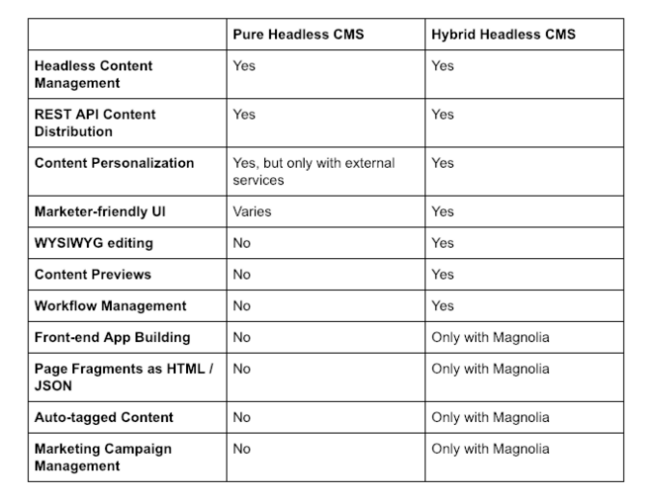 Die folgende Tabelle veranschaulicht noch einmal die wesentlichen Unterschiede zwischen einem reinen Headless CMS und einem Hybrid Headless CMS.