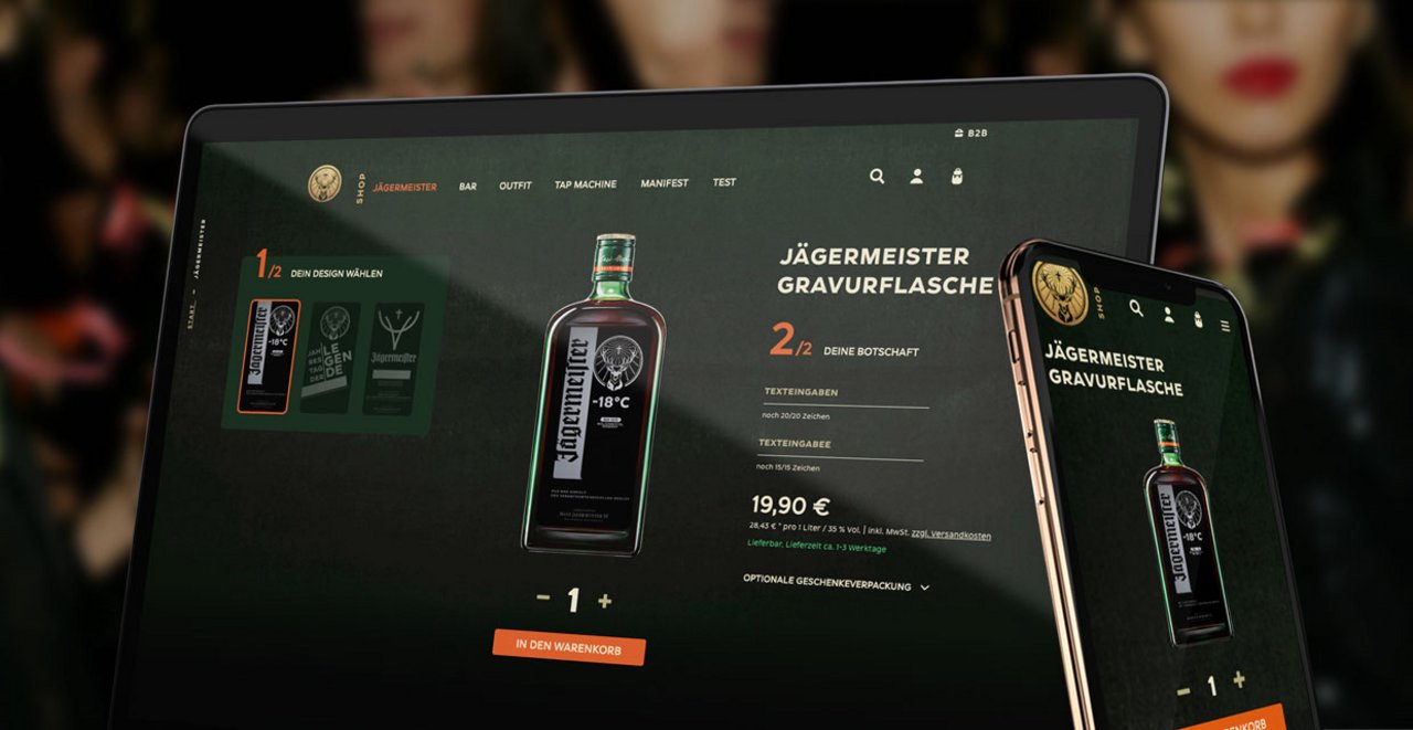 Der Jägermeister-Onlineshop bietet einige Funktionen, die an den aktuellen Bedürfnissen potenzieller Kunden ausgerichtet sind. Nutzer können hier beispielsweise individuelle Designs entwerfen oder mit einer Lasergravur Jägermeister-Flaschen personalisieren. Der Kultlikör folgt so im Zuge der „Superkühl -18°C“-Kampagne auch dem Individual-Commerce-Ansatz und bedient das Bedürfnis seiner Kunden nach individuellen, exklusiven Produkten.