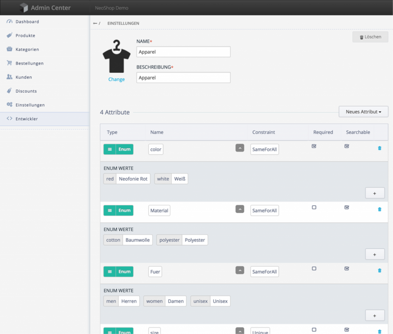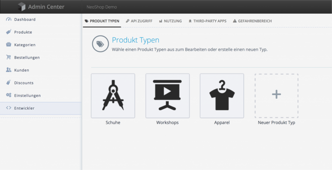 Sind diese Basis-Einstellungen für den Shop erledigt, kann die Pflege der Produktdaten begonnen werden. Dafür definiert man Produkttypen, auf denen die Produkte später basieren. Im Neofonie Demo-Shop haben wir die Kategorien „Apparel“ und Workshop“ gewählt.