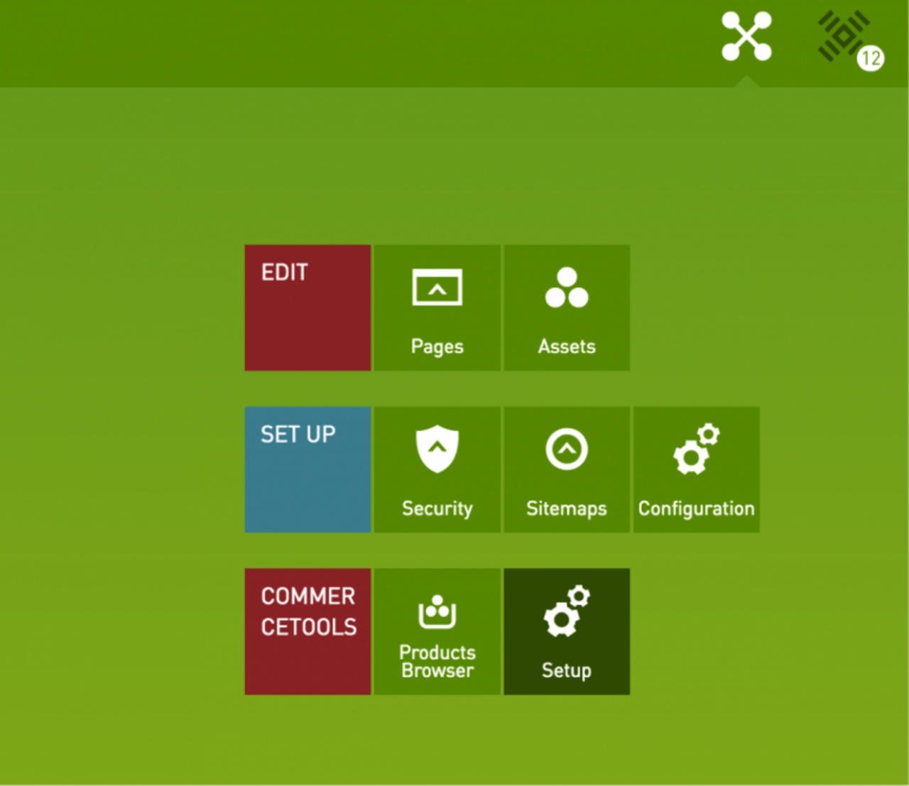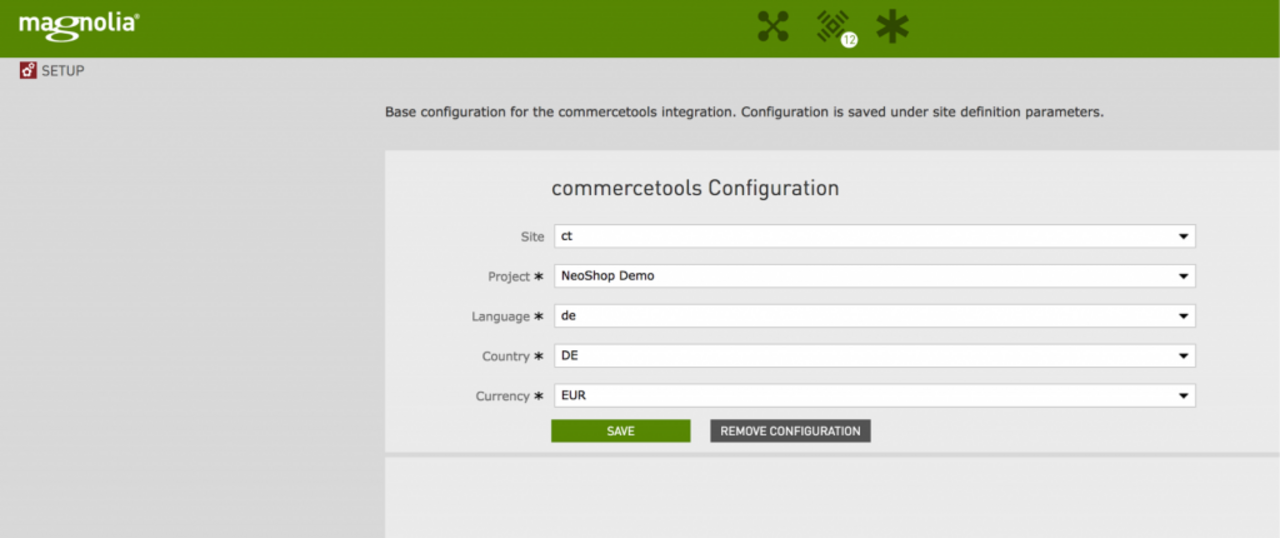 Im App Launcher steht außerdem eine neue App Group “commercetools” zur Verfügung. Unter Setup kann festgelegt werden, welches commercetools-Projekt für welche die Shop-Site in Magnolia verwendet werden soll.