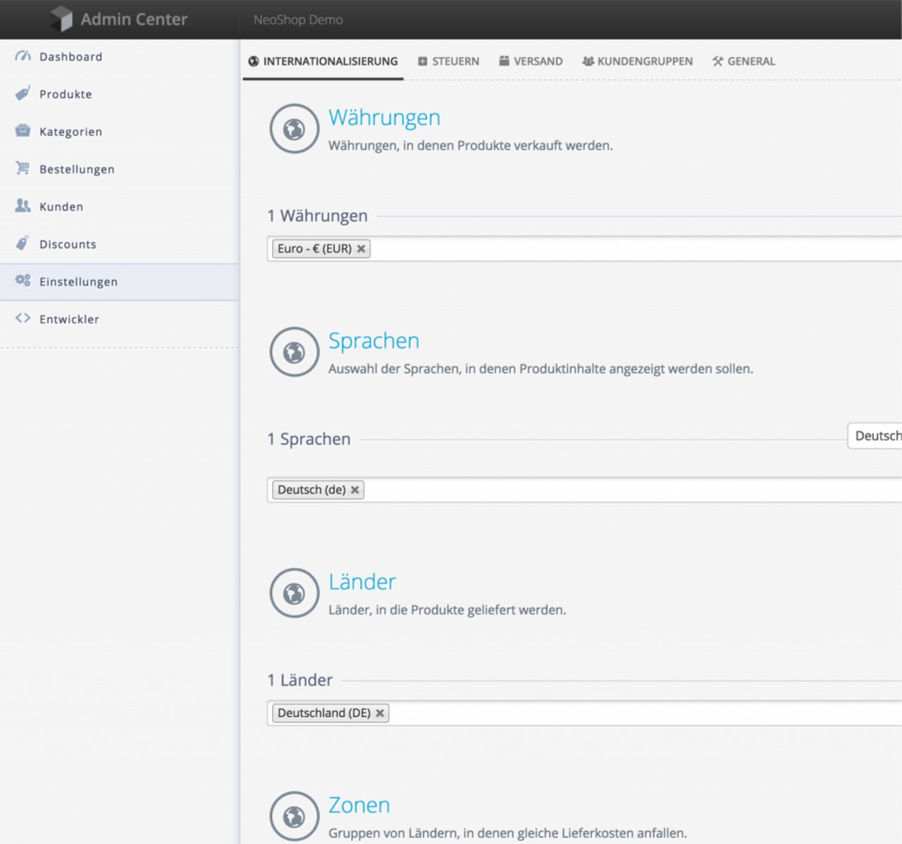 Daneben lassen sich im Setup Lokalisierungsparameter setzen. Im Falle des Neofonie Demo-Shop wurde nur der deutschsprachige Raum bedient.