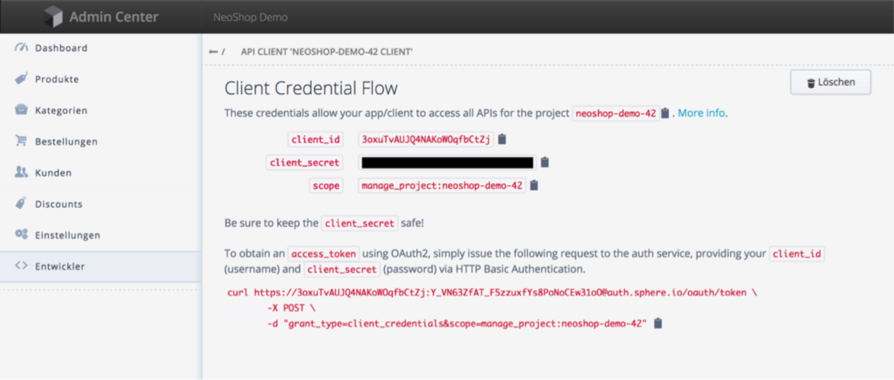 Hier werden API-BaseURL, Authentication-Endpunkt sowie clientID, clientSecret und projectKey aus Schritt 2 angegeben.
