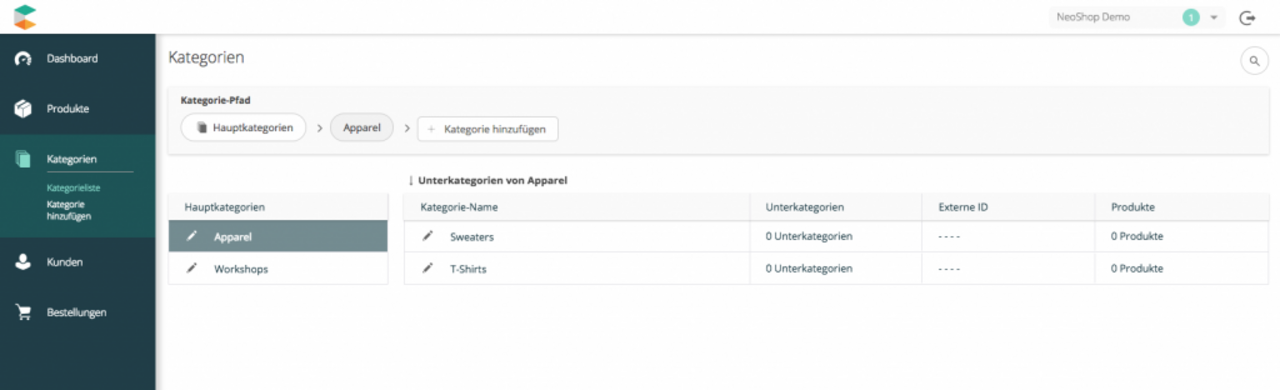 Darüber hinaus kann ein Kategoriebaum angelegt werden, der mit Produkten verknüpft werden kann. Damit ist es möglich, Produkte flexibel zu kategorisieren und Shop-Features über die Kategorisierung zu realisieren.