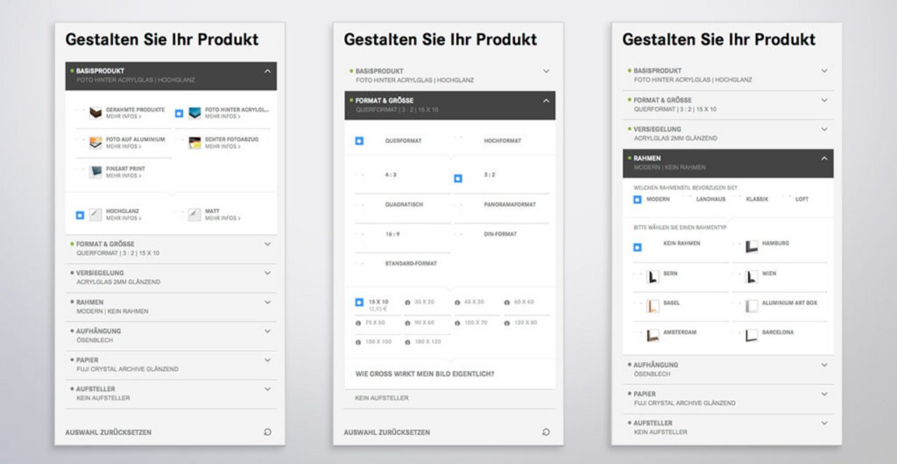 Jedes Bild kann nicht nur online bearbeitet, sondern auch über den smarten Produkteditor auf den Zentimeter genau zurechtgeschnitten werden. Anschließend kann der Kunde aus einer Vielzahl an Materialien wie Leinwand, Acrylglas oder Aluminium seinem Bild das passende Finish verleihen oder über eine Vielzahl an Rahmen aus den unterschiedlichsten Materialien zusätzlich in Szene setzen. Der besondere Clou: Der Shopbesucher sieht über den Produktkonfigurator stets die Voransicht des individuellen Produktes – inklusive der gewählten Optionen. So fühlt sich der Kunde wie in seiner eigenen digitalen Bilderwerkstatt, in der das Lieblingsmotiv mit unterschiedlichen Materialien über Bildbearbeitung und Ausschnitte individualisiert wird.