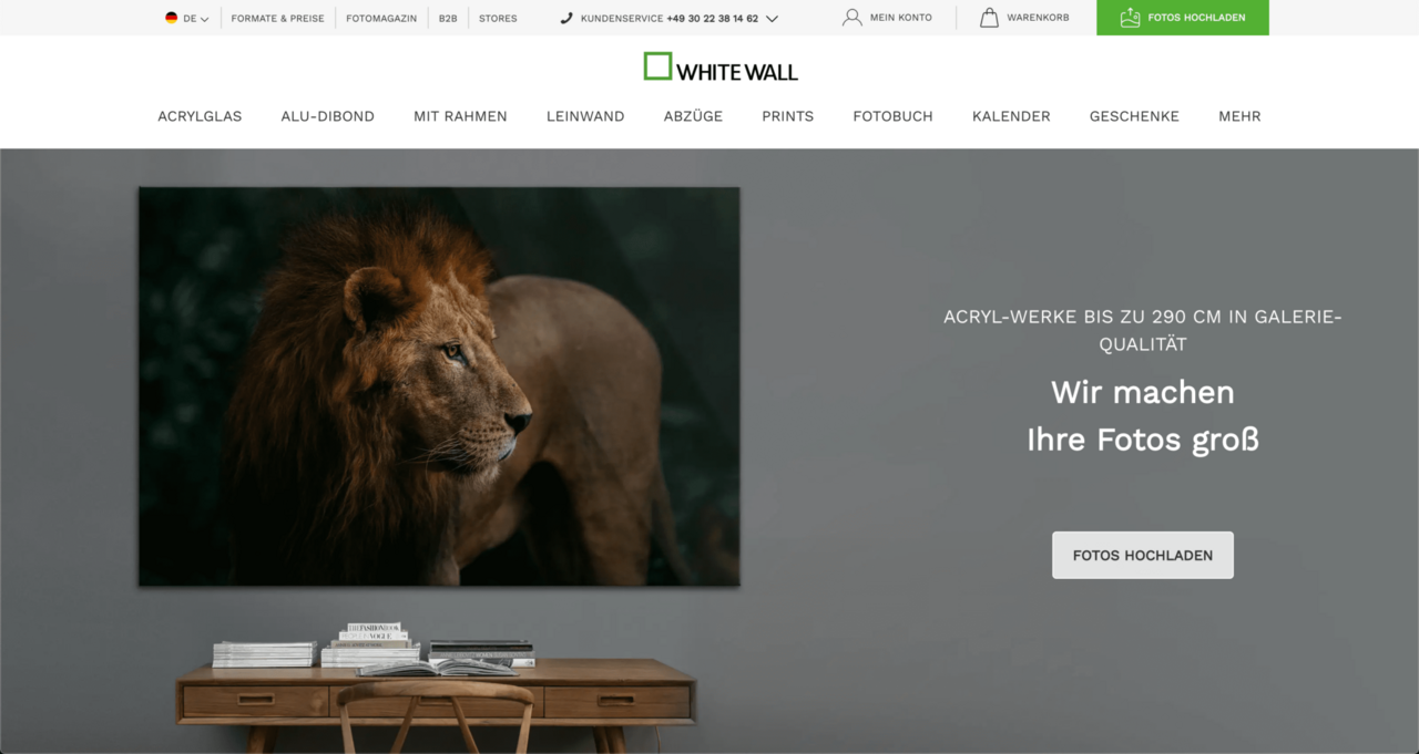 Im mehrfach ausgezeichneten Online-Fotofachlabor Whitewall.de können Hobby- und Profifotografen Bildmotive auf verschiedenen Materialien und in individuellen Größen entwickeln, drucken und rahmen. Durch frei wählbare Formatgrößen, Veredelungen und Rahmungen entsteht schnell und einfach das individuelle Kunstwerk für jeden Wohnraum und Geschmack. Intuitiv kann der Kunde beim Betreten des Whitewall-Onlinestores ein eigenes Foto hochladen, eines der 24.000 Motive auswählen oder einen Schnappschuss aus der EyeEm-Community aussuchen.