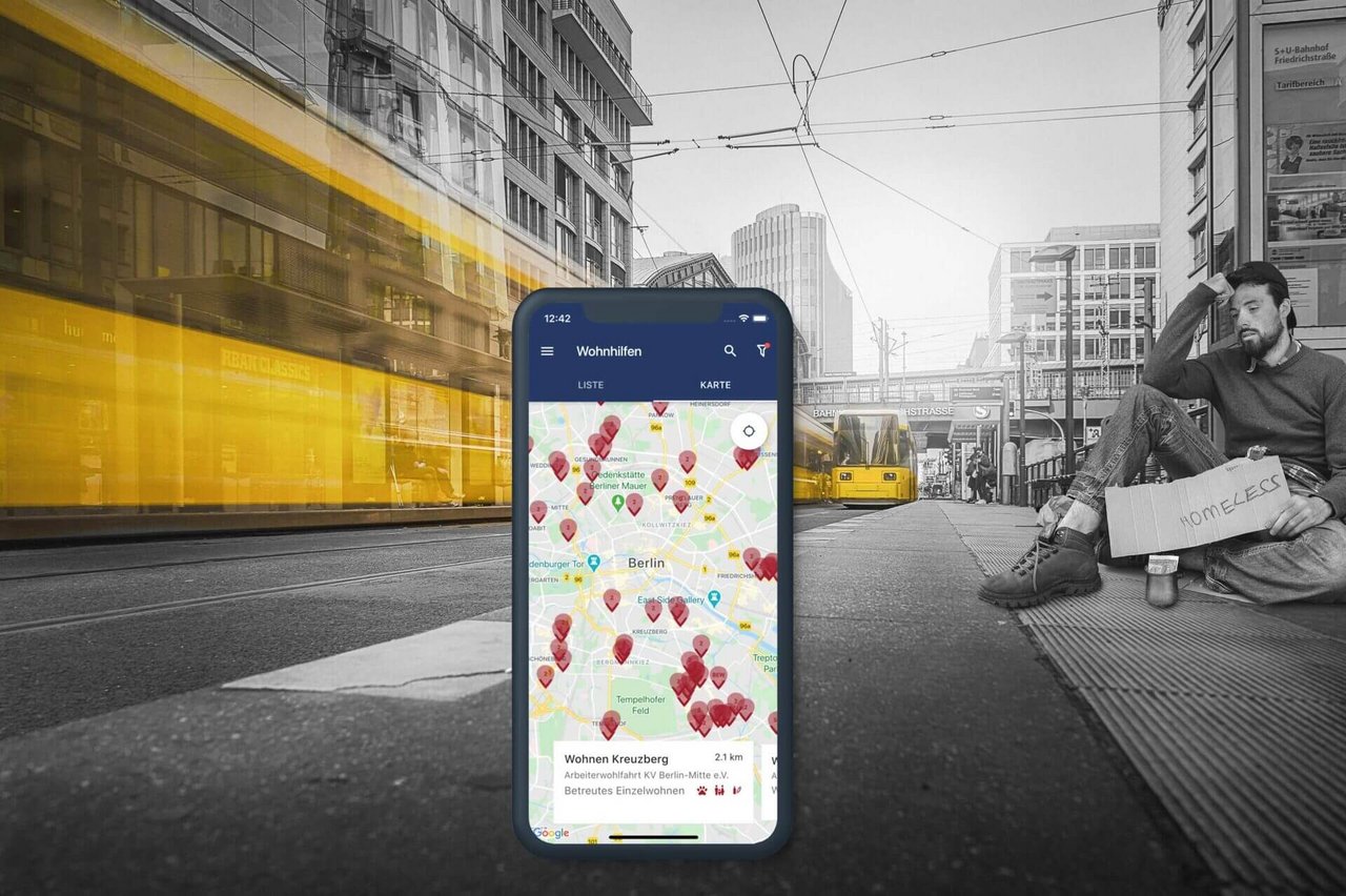 Die Berliner Wohnungsnotfallhilfe hilft Wohnungsverlust und daraus folgende Wohnungslosigkeit zu vermeiden. Bei bereits eingetretener Wohnungslosigkeit bietet sie Unterstützungsangebote, diese zu überwinden. Hierfür stehen Betroffenen zahlreiche Anlaufpunkte und Beratungsstellen zur Verfügung – vom betreuten Wohnen und Übergangshäusern bis hin zu Kriseneinrichtungen. Aufgrund des guten Erfolgs der Kältehilfe-App hat die GEBEWO Pro – gefördert durch das Land Berlin – Neofonie Mobile beauftragt, einen Wegweiser der Wohnungsnotfallhilfe zu schaffen.