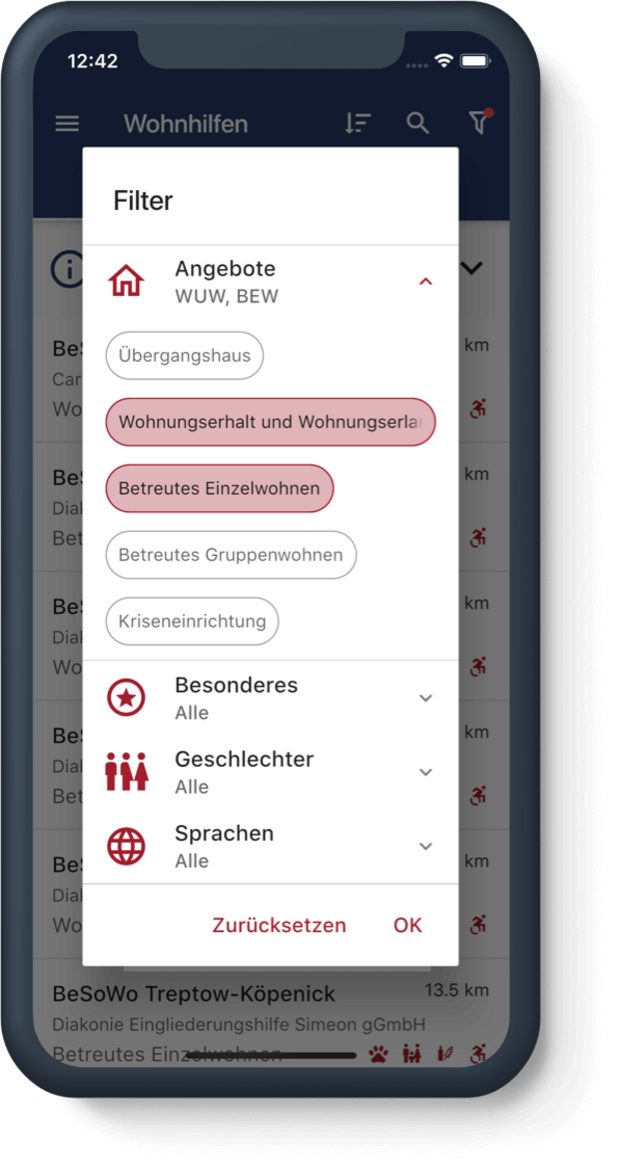 Das breite Angebot an Beratungsstellen und Einrichtungen der Wohnungsnotfallhilfe sind jetzt auf der Website sowie in der “Berliner Wohnhilfen” App gebündelt. Das Herzstück bildet eine interaktive Berlin Karte, die eine schnelle Übersicht und Kontaktmöglichkeiten für Betroffene bietet. Anhand von vielfältigen Filterfunktionen lassen sich schnell passende Einrichtungen und Kontaktinformationen finden. Die GPS Ortung unterstützt auf mobilen Geräten die lokale Zuordnung. Die App steht für iOS und Android auch offline zur Verfügung.