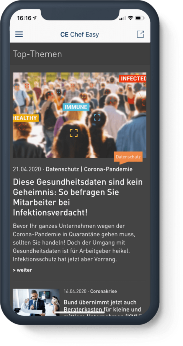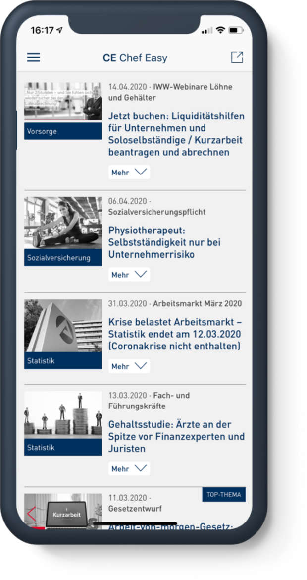 Die „CE Chef easy“ App bringt alle Informationen von der Website aufs Smartphone oder Tablet und bietet zugleich mobile Zusatzfunktionen wie Push-Notifications und eine native Navigation mit Offline Modus. Praxishilfen wie Checklisten, Musterformulierungen und Verträge aus dem Arbeitsrecht können direkt aus der App geladen werden. So hat der Nutzer alle relevanten Informationen auch unterwegs zur Hand.