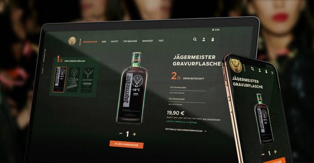 Das Shopsystem wurde durch individuelle Funktionen und Designs an die Anforderungen von Jägermeister angepasst. Dazu zählt der Laser-Konfigurator, mit dem die Flaschen personalisiert werden können oder auch individuelle Designs und Special-Editionen für spezielle Anlässe möglich sind.