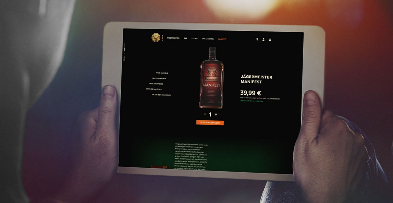 Der relaunchte Jägermeister-Onlineshop bringt unser neues Markendesign überzeugend zum Ausdruck. Gleichzeitig sprechen wir die unterschiedlichen Nutzergruppen differenziert an, sowohl im Design als auch was die Funktionen angeht.