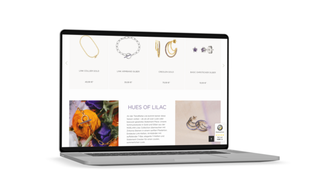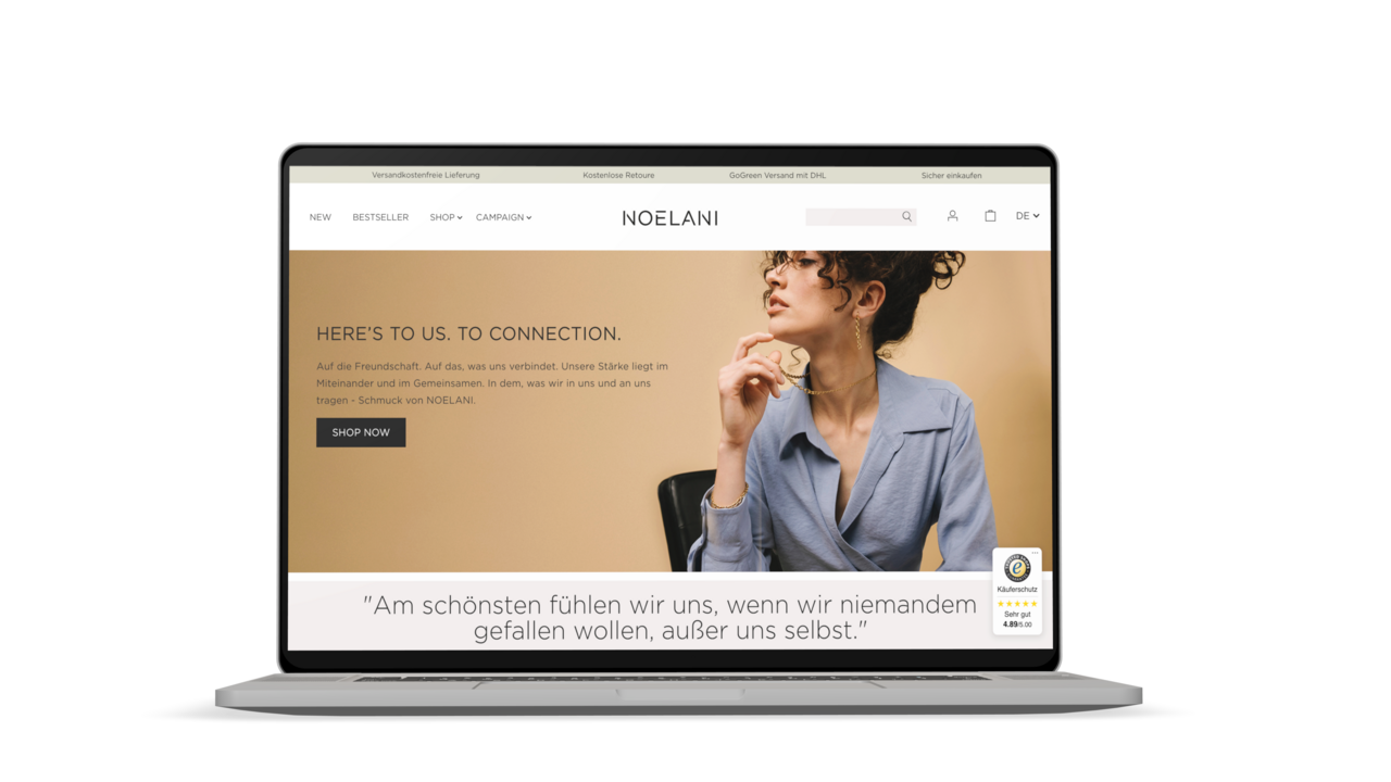 Auf noelani.de erleben Nutzerinnen eine durchdachte Benutzerführung. Wie im Ladengeschäft sollen sie durch das Produktangebot “flanieren”, Anregungen finden und einzigartige Schmuckstücke entdecken – ganz gleich auf welchem Gerät. Der Onlineshop setzt das Image der Marke perfekt in Szene. Unter dem Motto “EMBRACING A NEW INDIVIDUALITY” verbindet der Shop trendige Schmuckstücke mit Lifestyleelementen. Trendbewusste junge Frauen werden durch großflächige Bilder, Social Media Einblicke und extravagante Designs inspiriert. Der Shop ist damit eine wertvolle Erweiterung der Marke.
