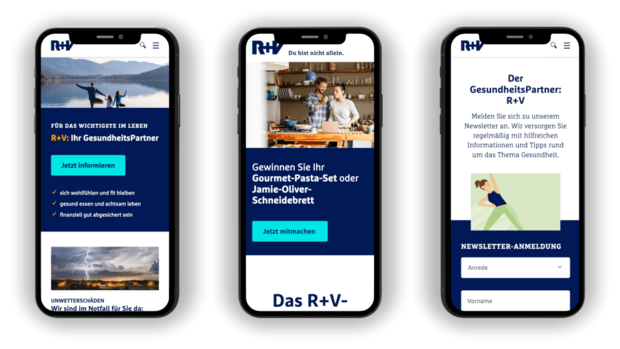 Die unterschiedlichen Bereiche der R+V Unternehmenswebsite wurden vereinheitlicht und in das neue CMS integriert. Im CMS Backend sind dazu eigenständige Bereiche für Privatkunden, Firmenkunden, Ratgeber, Presse, Karriere, Corporate Content, MeineR+V und die der knapp 500 lokalen Generalagenturen angelegt worden, auf die die verschiedenen Redaktionsteams getrennt voneinander zugreifen. Zudem wurden die besonders hohen Sicherheitsanforderungen im Finanzwesen umgesetzt, z.B. erreicht die ruv.de Website bei Security Headers Rating die Bestnote A.