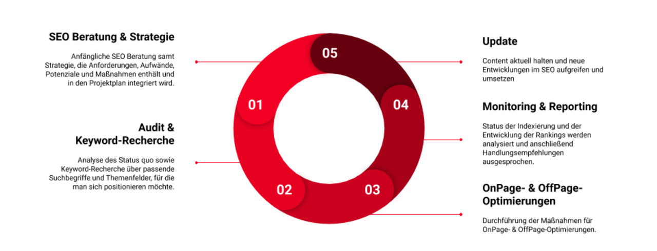 Unser SEO-Prozess gewährleistet, dass die SEO-Maßnahmen effizient ins Projektgeschehen eingebunden und umgesetzt werden. Nachhaltigkeit ist uns hierbei sehr wichtig. Wir zielen auf mittel- bis langfristigen Erfolg aus. Denn nur so können wir gewährleisten, dass wir relevanten Content erstellen, welcher über längere Zeit seine Rankings halten kann.